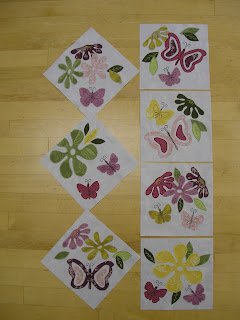 I use Steam-a-Seam 2 for appliqué. First I fuse it to the fabric, then draw the shapes on the paper-covered backing with the aid of a light box. (Yes, we have a light box. My husband bought it to view photo slides, but I think I use it more for tracing patterns on fabric. You can also tape your pattern and fabric to a sunny window. That method works just as well—the pattern shows right through, backlit by bright sunlight.) I cut out my butterflies and flowers, then removed the paper backing and fused them to the background squares. See my appliqué shapes below.